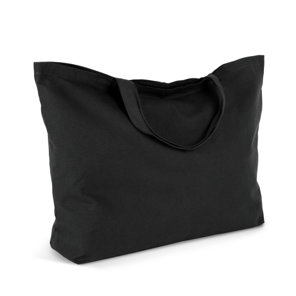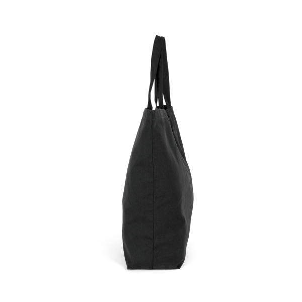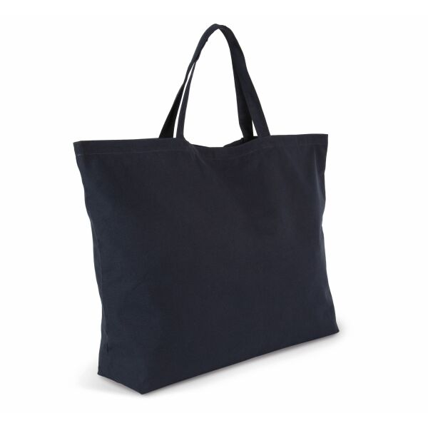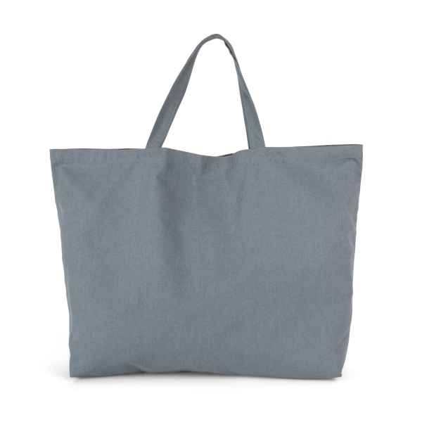 Gerecycled katoen/gerecycled polyester. Zeer grote shopper met handgrepen in dezelfde stof als de tas. Deze tas is onderdeel van het ‘K-loop’-project. Met dit project sluit Kimood de kring van de circulaire economie in de strikte zin van het woord. Het gebruikte katoen is immers afkomstig van het productieafval van de katoenproducten van het merk Kariban en uit het KARIBAN BRANDS-assortiment. Het toegevoegde polyester is afkomstig van de recycling van PET-plastic flessen. Tijdens het recyclingproces worden aan het garen tracers toegevoegd, namelijk viscose- en keramische filamenten die als een unieke digitale afdruk fungeren. De tracers weerkaatsen het licht op een unieke manier en dragen daardoor een unieke en onbreekbare code. Hierdoor kunnen we dus in een blockchain alle informatie opslaan over de processen waaraan het garen op unieke wijze werd onderworpen. Dankzij de Aware™-tracertechnologie en het bijbehorende blockchainplatform kan de eindconsument bij Kimood het hele productieproces volgen. Dit garandeert dat het product werd gerecycled met zijn eigen afval, zonder mogelijke aanpassingen aan het proces. Een speciaal label met een QR-code biedt toegang tot het Aware™-platform. Zo kunnen de certificeringen makkelijk worden geraadpleegd met een smartphone.