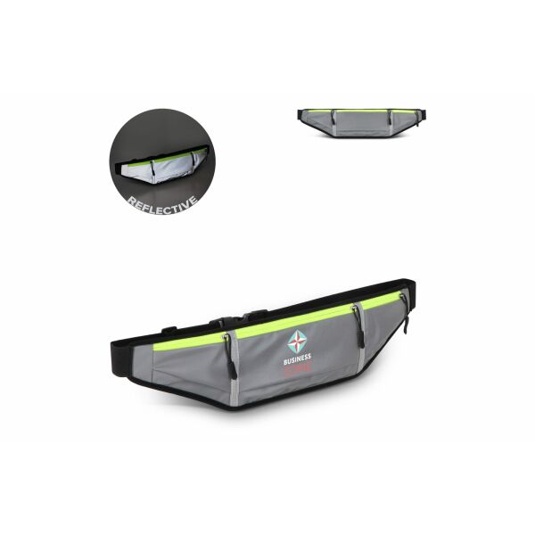 Reflecterende hardloopheuptas met neongele rits. Eén hoofdvak en twee zijvakken voor telefoon, sleutels, snacks of tissues. Mesh-achterkant voor ademend vermogen en elastische tailleband (80–106 cm) voor een veilige en comfortabele pasvorm tijdens het hardlopen.