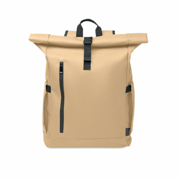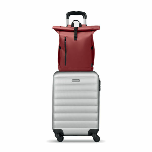 Rolltop 15 inch laptoprugzak van PU-gecoat 600D RPET polyester en RPET polyester voering. Gevoerde mesh-rugzak met ritsvak en trolley riem. Gevoerde schouderband met mesh-afwerking aan de binnenkant.