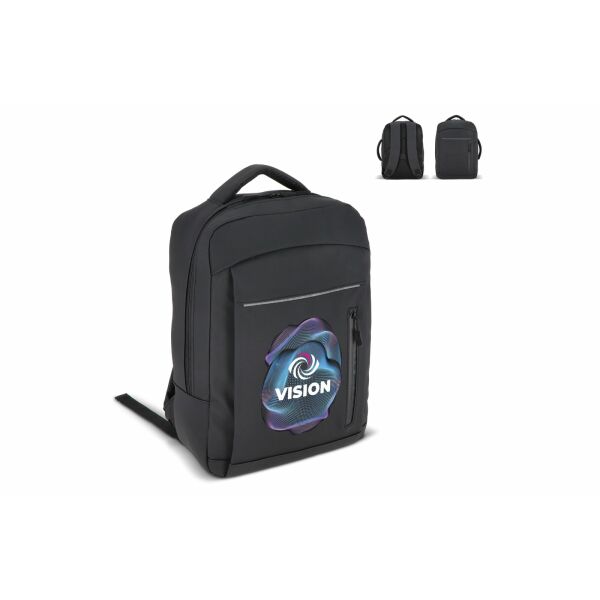 Laptoprugzak van PU-materiaal met 210D voering, geschikt voor de meeste 15,6" laptops. Voorzien van gewatteerde, verstelbare schouderbanden en een gewatteerde mesh achterkant voor extra comfort. Met boven- en zijhandgreep, trolleyband, reflecterende strip aan de voorzijde, voorvak met rits en verborgen vak voor waardevolle spullen, plus georganiseerde binnenvakken.