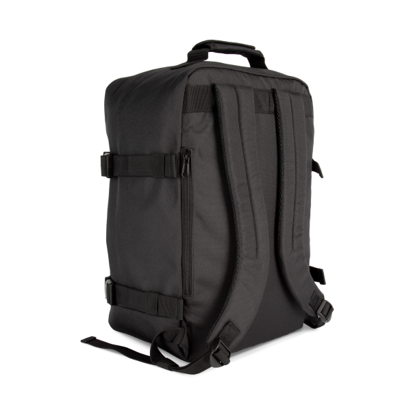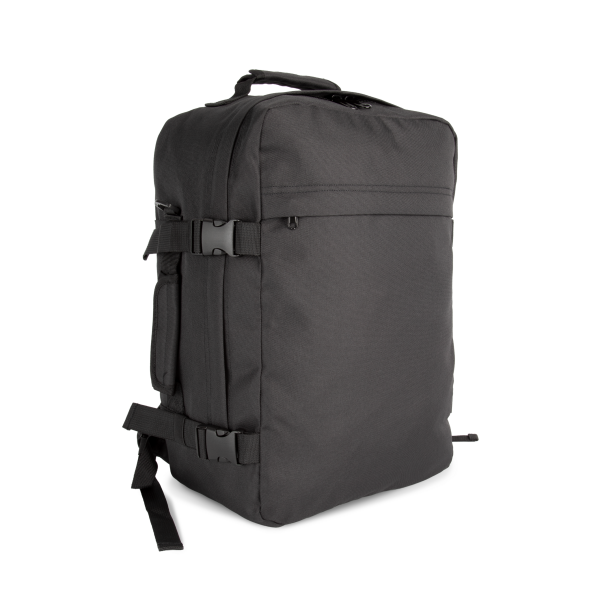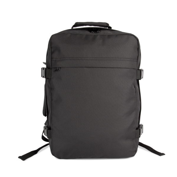 100% polyester. Reisrugzak in cabineformaat. Platte opening met ritssluiting om kleding makkelijk op te bergen. Gewatteerde handgrepen bovenaan en opzij, voor een eenvoudig transport. Ergonomische, ademende en gewatteerde schouderbanden, net als de achterkant, voor optimaal comfort. Grote ritszak aan de voorkant, ideaal voor personalisatie. Twee binnenzakken op het voorpaneel. Grote binnenzak met rits op het achterpaneel, perfect als tweede vak. Gespen met drukriempjes op de zijpanelen.